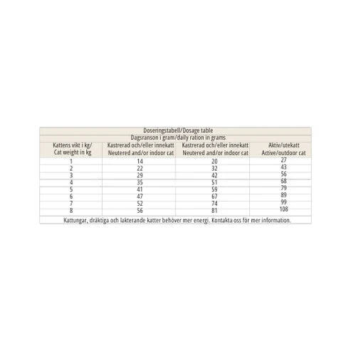 Rekommenderad fodergiva baseras på kattens vikt och aktivitetsnivå. Använd doseringstabellen på förpackningen som vägledning och justera vid behov. Utfodra gärna flera gånger om dagen eller låt fodret vara tillgängligt dygnet runt. Katten ska alltid ha tillgång till färskt vatten.