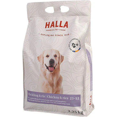 Halla Kyckling & Ris 23 - 12 är ett komplett, vetefritt helfoder som är speciellt utformat för normalt aktiva hundar i alla livsstadier. Detta köttbaserade foder erbjuder en hög smältbarhet och en smak som även de mest kräsna hundarna uppskattar.